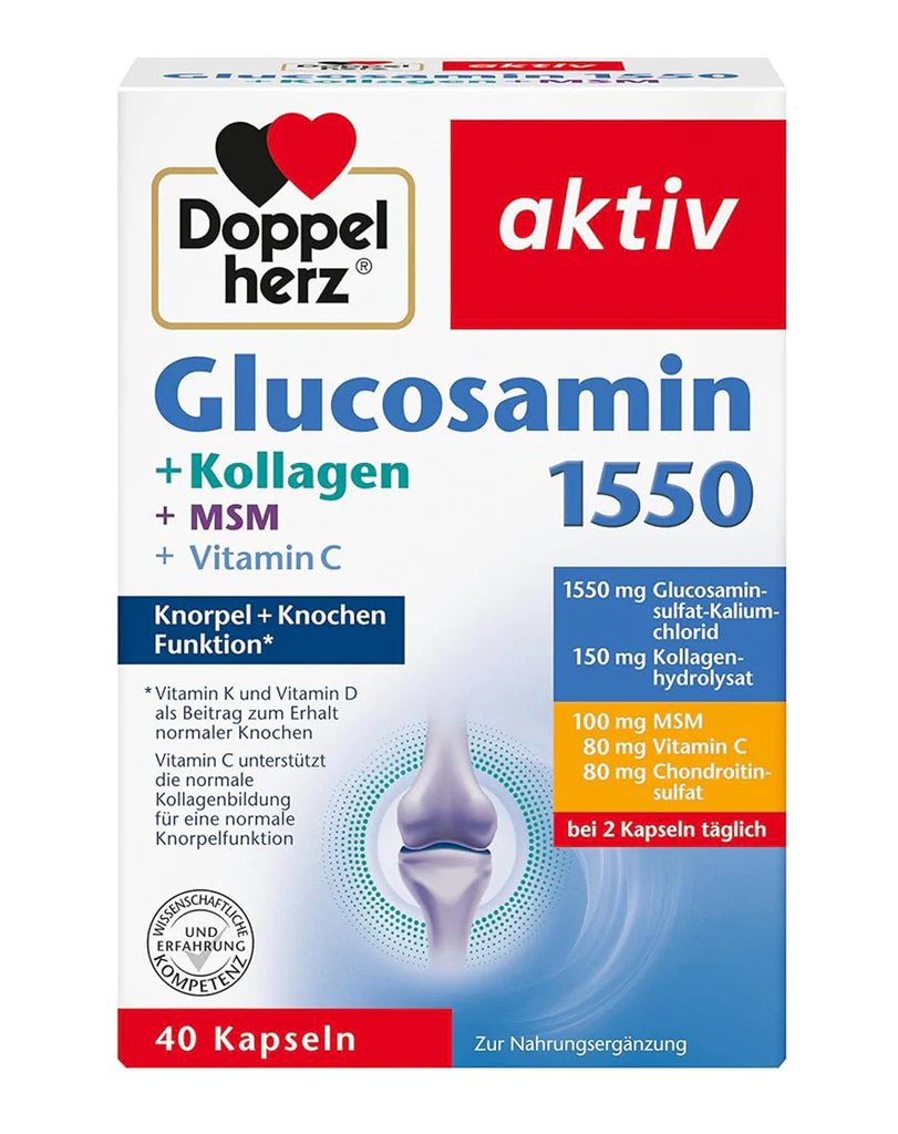DoppelHerz Glucosamin 1550 + Kollagen + MSM + VItamin C është një suplement ushqimor që ndikon në mirëqenien e sistemit musculoskeletal.